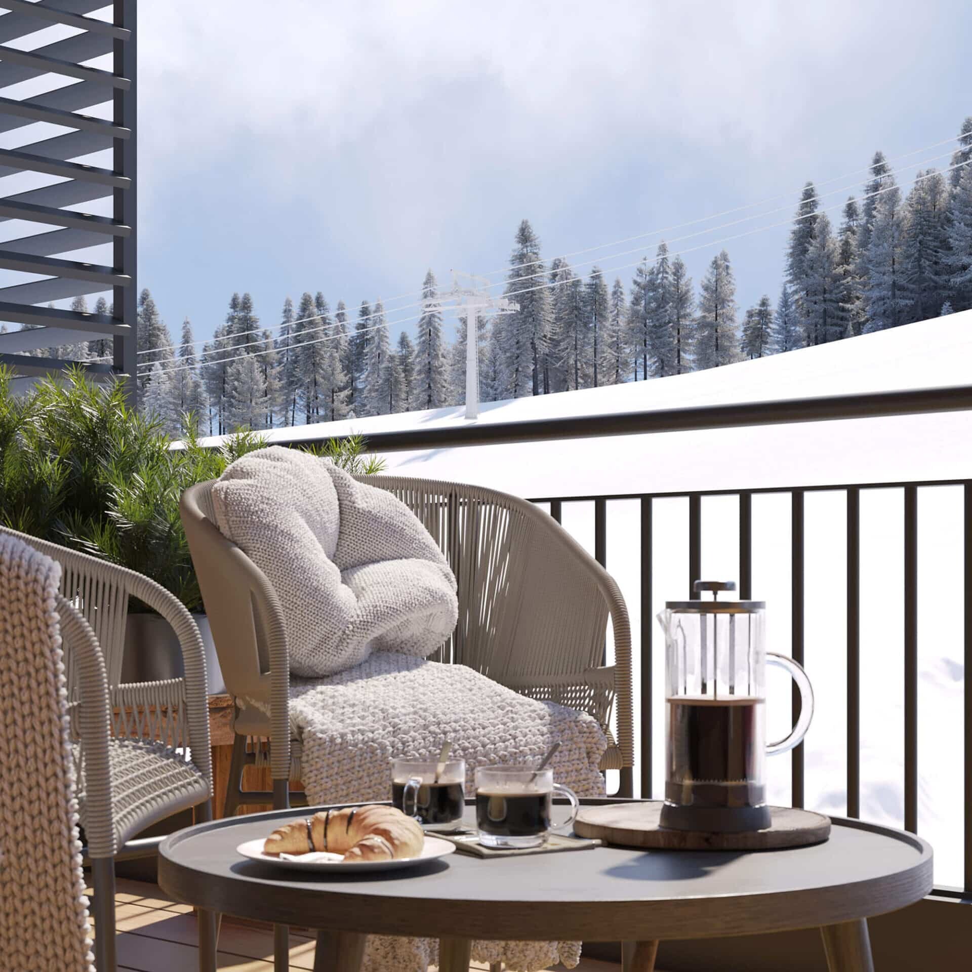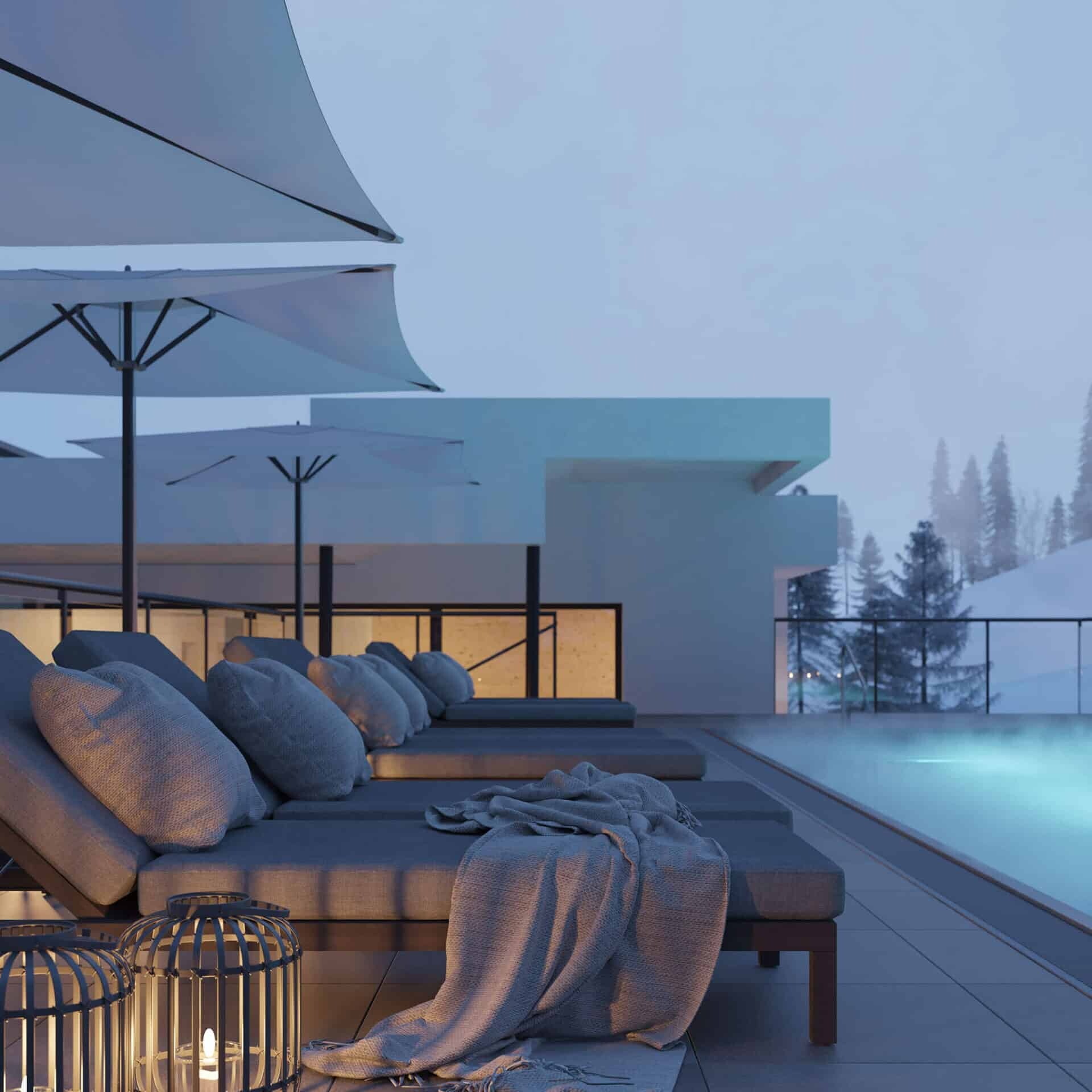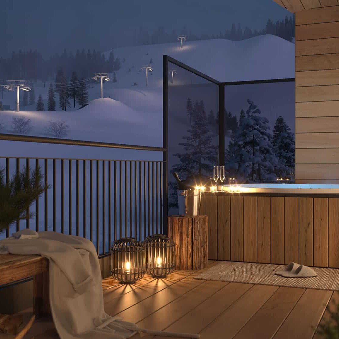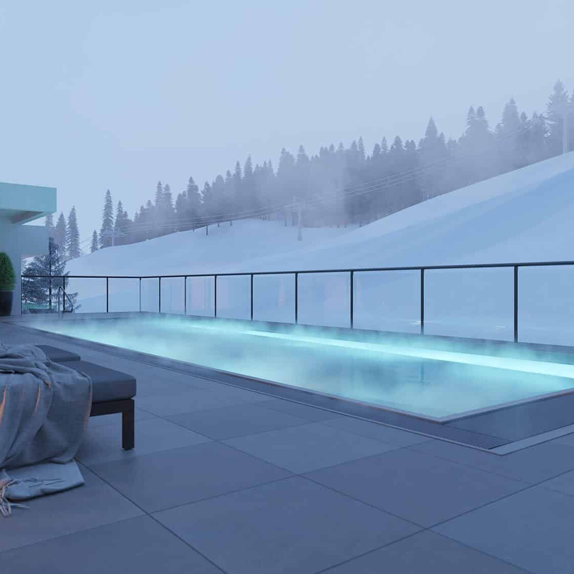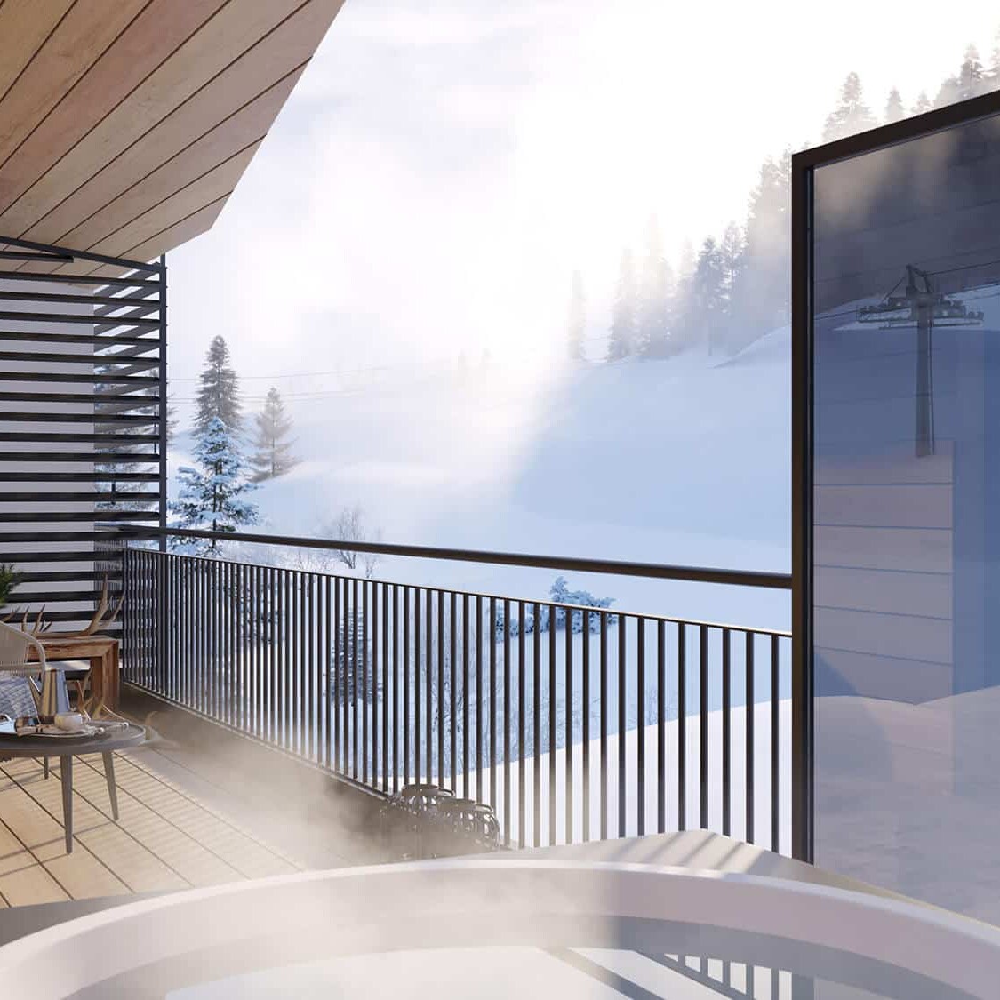 Geniet van een panoramasauna en zwembad direct aan de piste. Liever in alle rust ontspannen? Elk appartement beschikt over een privé sauna en een warmwaterbad op het terras, beide met adembenemend uitzicht op de bergen.